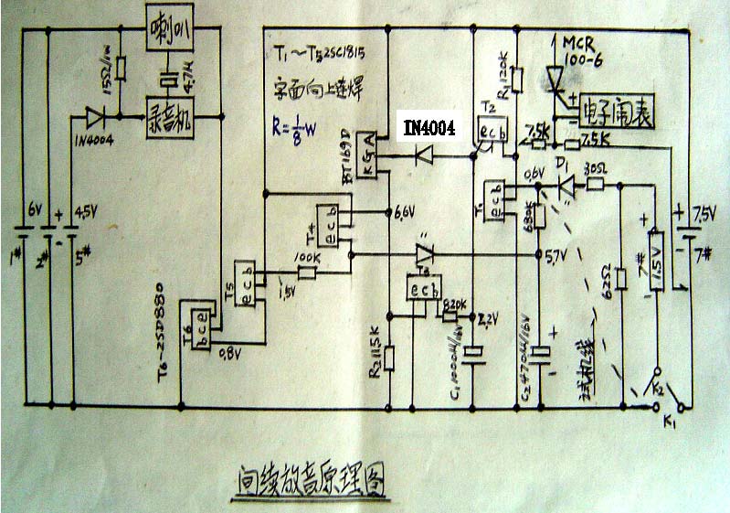 ①建议按图示位置做成网状电路附在喇叭外表用透明胶带封好,不易短路,便查看。②若要两倍放音2:1,可把C1、C2电容量增加一倍(放音时间是随7.5V电源下降而递减)。③T6管功率较大有热量单放散热处。④1号6V电池放喇叭盒内,2号5号7号绑盒外。⑤去掉原喊话器(喇叭)开关键板,留下功放板上的三根色线(“左红”正极,“中黑”负极,“右绿”音频),把电池仓盖板6V正极直接“左红”,把盖板负极(弹簧)黑线直接T6管的e极,T6的C极直接“中黑”。