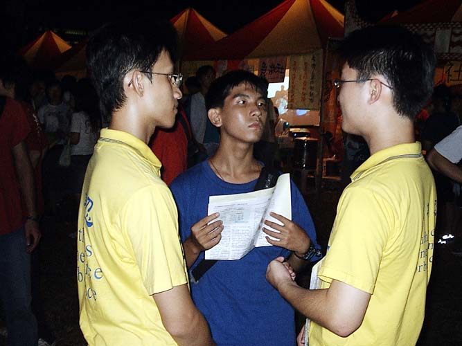 有的人会说:“我是大二了”或“我是什么什么社了”。学员亲切的说:“没关系啊,你不一定要加入法轮功社,认识一下法轮功,对你以后可能也会有益哦!”学员的无私精神可嘉,甚至到学校散步的阿婆都不愿放弃,趁着办活动的声势,去跟她们介绍。