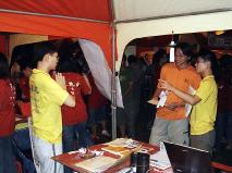 学员在摊位上摆了笔记型电脑,播放中央大学上次的音乐表演节目。随着学员面带微笑的递上传单,用明亮的声音说出:“欢迎加入法轮大法社”或“欢迎你来认识法轮功”之类的话,起到了不错的效果。凡是走到摊位前的人,十之八九都愿意听学员介绍法轮功,并留下加入社团的资料。