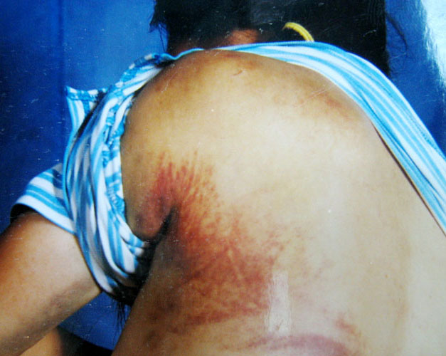 到了那里,它们就把我推向小屋,让我给它们跪下,我说我犯的什么罪,你们这样对待我,它们就恶狠狠的把我踹跪下,连打带骂的说你老公爹看不起我们,我让你不老实。打了好大一阵儿,然后就又让我出去上院子当中,那有一棵大树,就把我吊起来,手还依然铐着,连打带骂的说人家都上北京去,你为什么不去,你去了好让你去劳教,就这样一直吊着打,还用管子往我身上浇水,往我的脸上浇水,让我说。我问它们让我说什么,它们说你不是学真善忍吗,我说是啊,我没有错。它们说我嘴硬,就把着我的头把水往嘴里浇,还用橡胶棒打我全身,打的不像样子,就这样在那里吊了好几天,最后它们才通知家里人拿500元钱交给它们才让我回家。