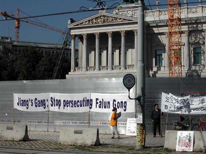 【明慧网2004年9月4日】2004年9月1日上午,贾庆林到奥地利国家议会。法轮功学员在议会前打开横幅揭露江××及贾庆林等对法轮功学员的残酷。奥地利议会位于维也纳内城环线上,是维也纳城内交通最繁忙的地段之一。过往的车辆都看到了学员们举着的横幅,有的还鸣笛表示支持。许多过往的行人得到了介绍在中国发生的对法轮功学员的迫害的真象材料。