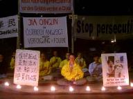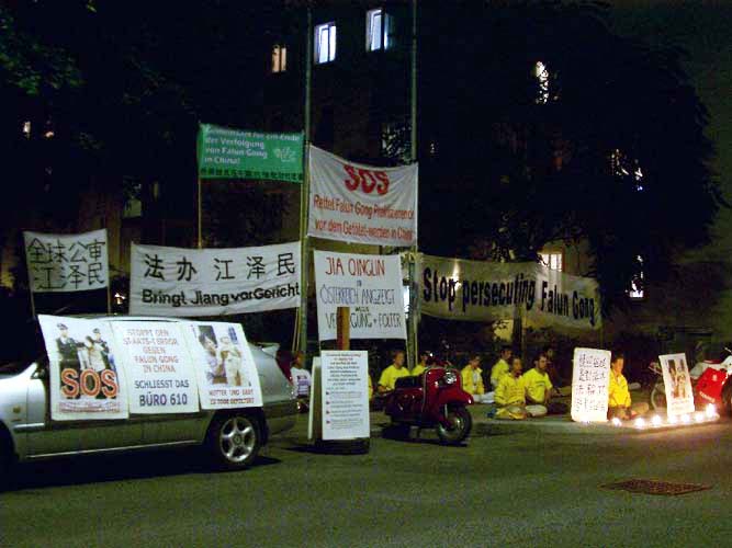 2004年9月1日晚,法轮功学员们在中国驻奥使馆前举行了烛光守夜,谴责贾庆林等参与的残酷迫害,呼吁立即停止迫害。