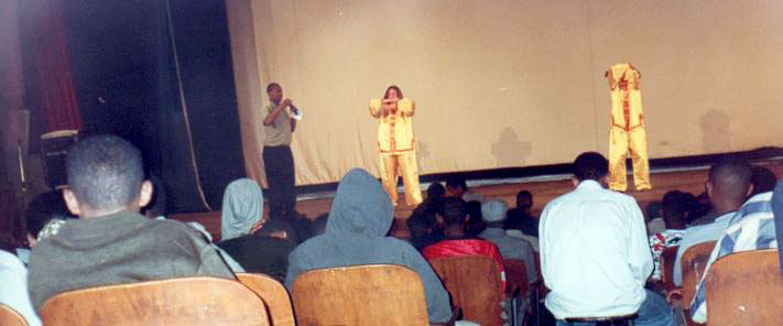 另外,学员们受当地一所武术学校邀请参与其年度公开表演。活动在市里一家有名的艺术表演厅里举行。我们演示功法并发放传单。现场大约有一千名观众。