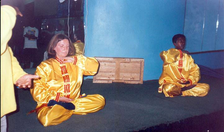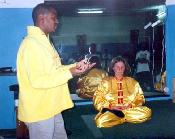 正当学员们正准备炼功时,机器出了问题导致无法播放有着“普度”的音乐光盘。一位学员鼓励负责的工作人员不要灰心,继续尝试。当时表演厅里一片寂静,观众期待的等着并望着台上穿着金色炼功服的学员们。一会儿音乐就响了起来。