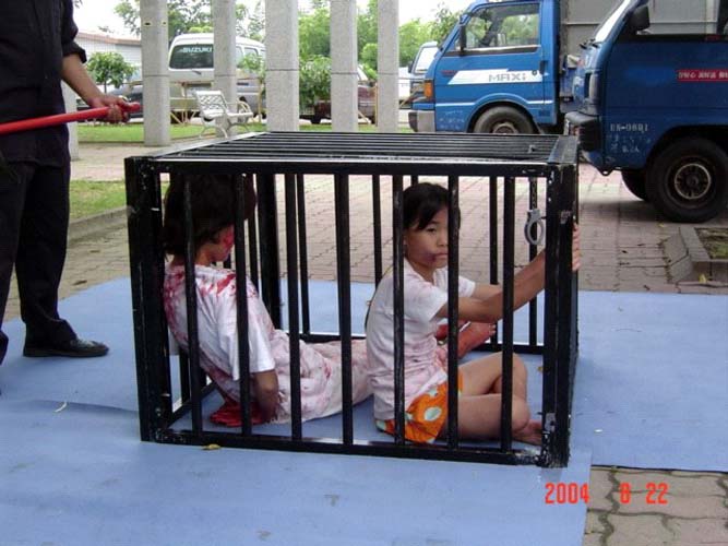 ![]() 小弟子扮演受迫害小朋友,和妈妈一起被关在铁笼里 | ![]() 真人模拟展示酷刑 | ![]() 大家一起来踩江,唾弃暴政 |