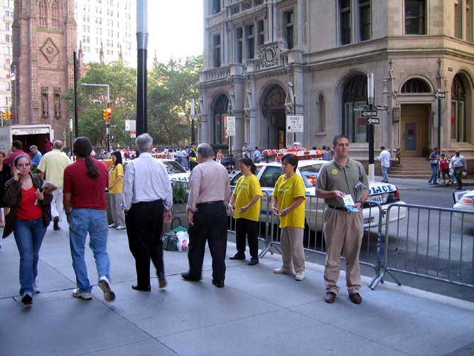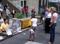 一位仔细看过法轮功真象内容的男士,对功法非常的感兴趣,遗憾的是当时学员手里有曼哈顿炼功地点的传单已被全部发完,只好推荐他上网去找相关的信息。他还说学员应该带书来,现在他只好上网去购买了。