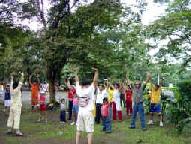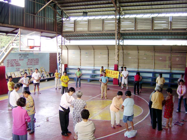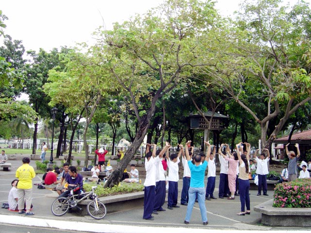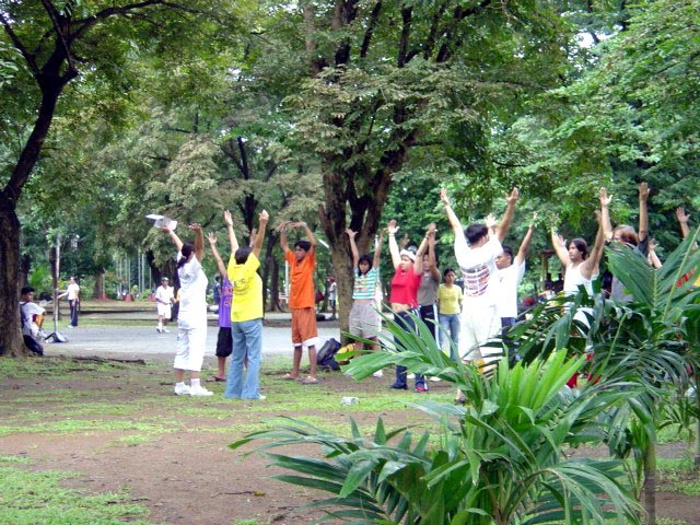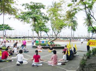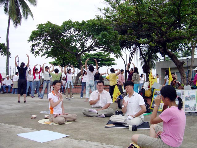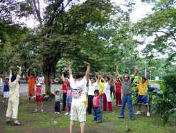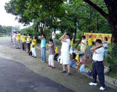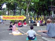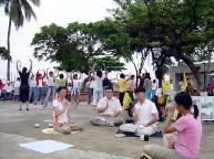 马尼拉有几个炼功点,有一个公园每个周日菲律宾学员会在这里集体炼功。假日早上运动的人很多,绝大多数是菲律宾人,很多人愿意听法轮功真象,甚至当场学炼五套功法。台湾学员将带来的汽球送给小朋友,只见公园到处飘着五颜六色印有“法轮大法好、世界需要真善忍”中、英文字样的汽球;有一个菲律宾人带着全家三口来这个公园休闲度假,一看我们在义务教功,不但自己学炼起来,还找他的家人一起来学炼五套功法。