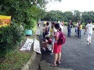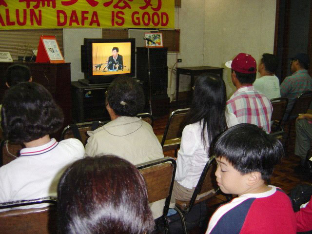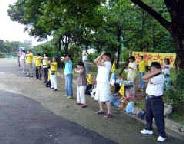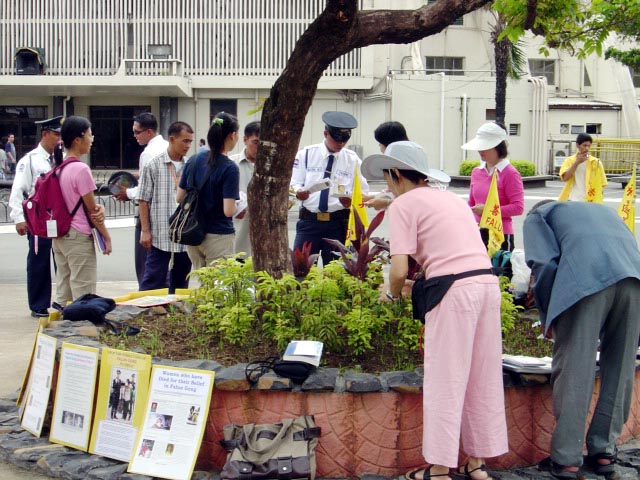 在菲律宾约有300万的华侨,很多人受到江氏集团的不实宣传,对法轮功印象不好,尤其是年纪较大的,有些连看、听都不敢。有几个华人去年来撕横幅踢展板的,今年有一个又来踢展板叫警察,台湾学员欢迎他们找任何单位来,因为来一个就讲清真象一个,每天那个恶人都去告警察,警察都被他弄烦了,也只是来场边绕一下就走了。甚至有一天他们的主管骑车来说“你们要做什么就做什么”还跟一大群来学功的人合唱“法轮大法好”,菲国警察十分支持法轮功。