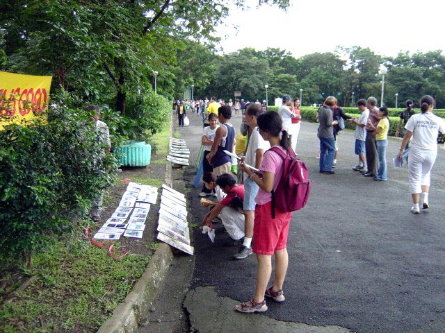 早上5:00在马尼拉的Luneta公园炼功洪法,这个公园每天有很多中国人运动,这里也是菲律宾同修认为最难讲真象的部分,因为他们不懂华语,所以这次台湾学员帮他们做了一个自由免费取阅的牌子,让华人自己来拿资料。