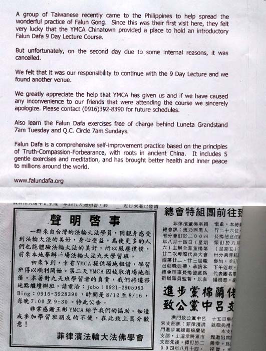 原本YMCA答应借场地办九天班,但不知怎么突然通知场地不借了,知道他们受到某些压力不敢明言,法轮功学员宽容YMCA悔约的行为,另外找场地,隔天在报上刊登了一份声明启事(见图片)