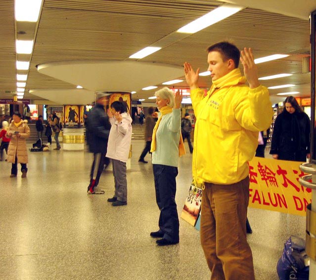 路过大厅川流不息的人们,有的驻足看功法演示及展板,有的与学员交谈了解真象,很多人接资料,不时听到人们说着:法轮大法。