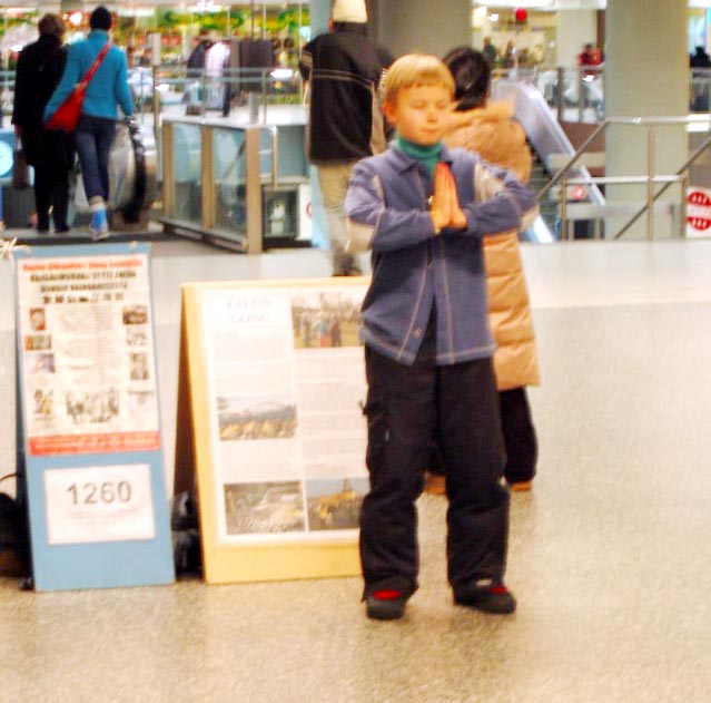 值得一提的是一个11岁的芬兰小弟子,他随妈妈从遥远的中部城市驱车而来,在三天的活动中,一直与成年同修一样,认真的学法、炼功、洪法和发正念。6日那天恰逢他的11岁生日,法轮功学员们分别用三种语言(芬、英、中)唱着“生日歌”与他一起愉快的度过了他的11岁生日。