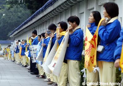 台湾法轮大法协会成员组成一六公里长的人墙,呼吁大陆停止镇压法轮功学员。