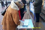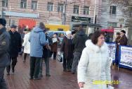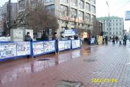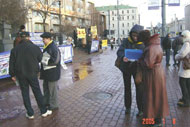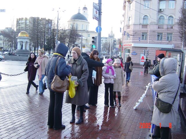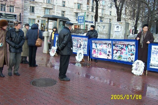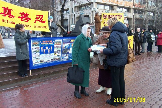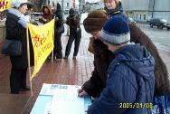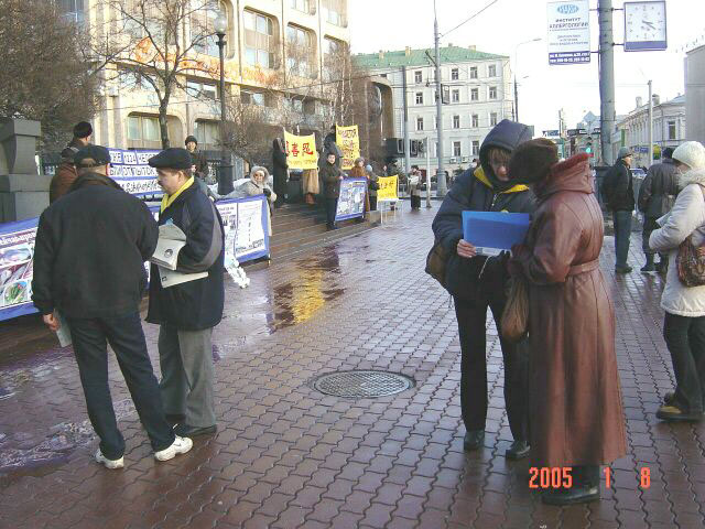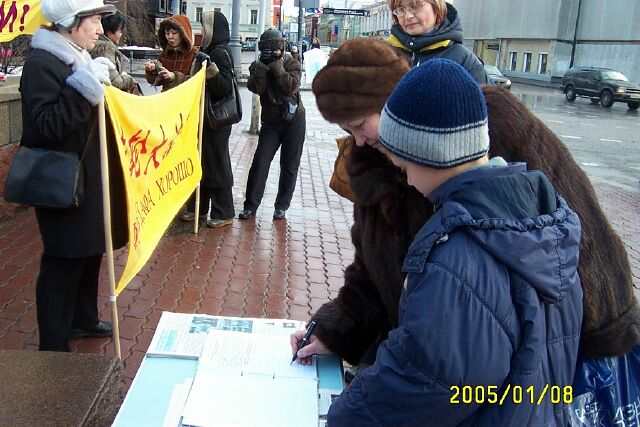 【明慧网2005年1月11日】2005年1月8日(星期六)俄罗斯法轮功学员在莫斯科市中心、塔斯社大楼旁边的广场举行集会,呼吁制止在中国仍在進行着的对法轮功的迫害。学员们用中、俄文打出“真善忍”、“法轮大法好”横幅及大法洪传世界60多个国家的大幅图片,向世人展示法轮大法的美好。同时用中、俄文打出“至今在中国已被迫害致死法轮功学员1266名”,及江氏集团用百种酷刑残酷迫害法轮功学员的多幅图片,揭露江氏流氓集团“群体灭绝”,和“反人类”的种种罪行。学员还用麦克风向来往车辆和过路行人介绍法轮功及中共江氏集团迫害法轮功的真象。