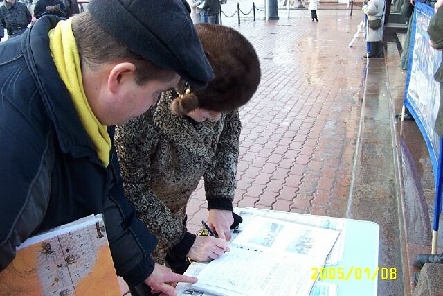在签字桌前,人们排队等候签字声援法轮功学员、呼吁停止迫害和支持公审江××。一位老先生在自己签字后没有离开,又主动帮助学员发传单并呼吁大家都来签字支持法轮功;有一位女士在了解真象后对学员说,她的工作性质需要她经常去全国各地,她表示会将法轮功真象告诉她在各地的所有的同事和朋友;有几个小伙子开始以为这里是在彩排,看到警察扮演者对着受酷刑的学员扮演者举起警棍,开玩笑的说:“你可别真打呀!”扮演警察的学员告诉他们这里是演示正在中国发生的对法轮功学员的大规模镇压和酷刑迫害,几个小伙子明白后,立即站到了排队签字的队伍中……还有一位先生在听了真象后对学员说,他知道六•四民主运动,知道共产党的独裁专政……。当学员告诉他迫害法轮功的元凶是江××,这位先生说:“这样的人将来结局肯定好不了,祝你们的起诉成功。”