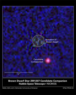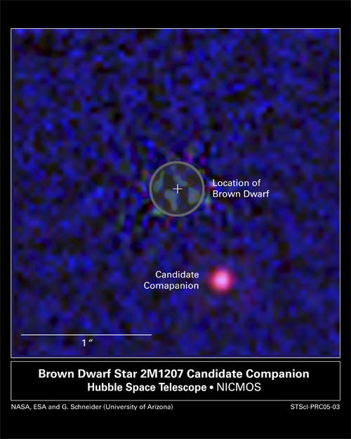 哈伯太空望远镜最新拍到的这张图片确认了欧洲南方天文台的图片。欧洲南方天文台于2004年4月在智利用红外线发现了这颗行星。这颗行星比太阳系中最大的行星更大。
