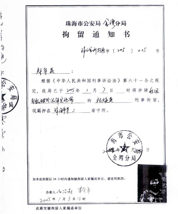 ![]() 对杨焕英的非法拘留证 |
