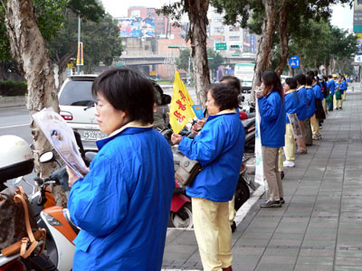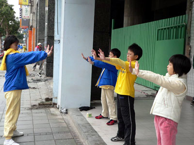 今天的活动包括“正义长城”、排字、炼功还有酷刑展,妈妈告诉我这个酷刑展是大陆同修在中国劳教所内所受酷刑的真实体现。看到这些恐怖的画面,即使天气很冷还下着毛毛雨,我们还是坚忍的站在街头。因为,比起大陆同修,我们的修炼环境好太多了。听妈妈说今天共有三千多名法轮功的学员,从台湾各地来台北参加活动,为的就是要呼吁中共停止对法轮功学员无止尽的残酷迫害。