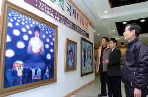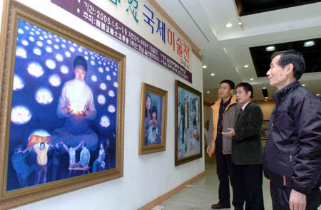 展示遭受中国政府(江氏集团)镇压的法轮功学员风貌的真、善、忍国际美术展截止到9日在蔚山文化艺术会馆第4展厅举行。由6位中国画家及4位海外画家所创作的30余幅画作描绘了他们所遭受的迫害以及在修炼过程中体验到的美好境界。部分画家还描绘了自己所直接经历过的迫害。酷刑拷问,被监禁的孩子等这些都表达了法轮功学员们在非人的镇压面前百折不挠的信念以及对真、善、忍的追求。法轮功是由李洪志创立的一种气功流派,现已传播到世界上30多个国家,有1亿多人在修炼。99年政府(中共江氏集团)将法轮功定为非法团体,并开始镇压。由韩国法轮大法学会釜山庆南蔚山总辅导站主办的国内巡回画展于去年9月在大邱举行,蔚山是此次画展的第九站。