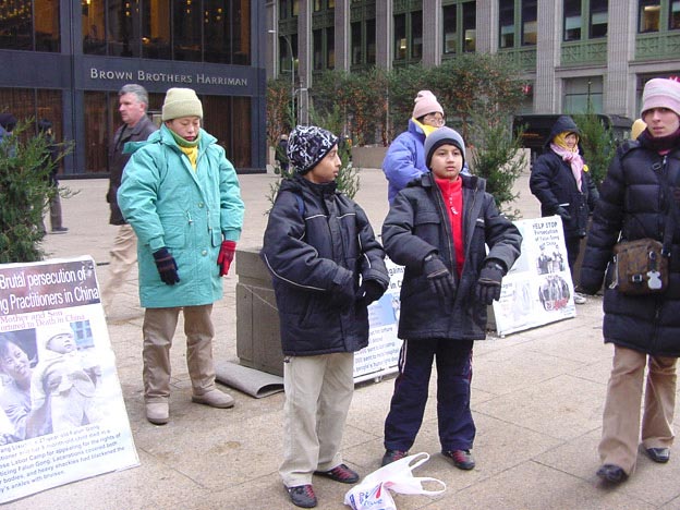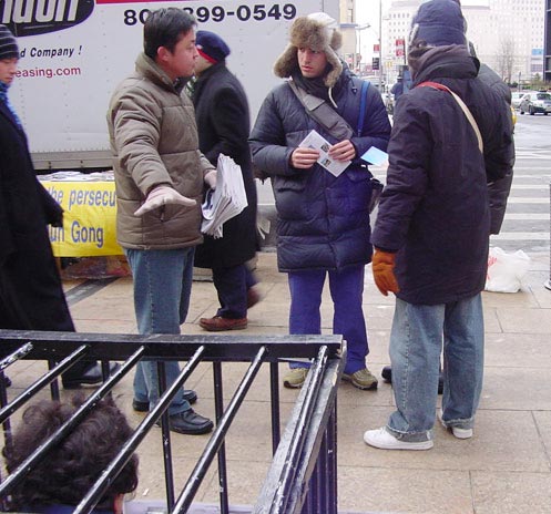 有一位不会讲英语年纪大的女学员,每天早上在GROUND ZERO地铁口发资料。有一次,她看到一些西装革履的中国人走过来,就反复的说,“中国同胞请记住‘法轮大法好’。”忽然,一位中国人返回身来告诉这个学员:“我记住了,法轮大法好”。