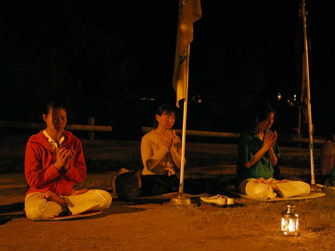 ![]() 2001年6月瑞典哥德堡市中心广场集体炼功 | ![]() 2001年10月法国巴黎埃菲尔铁塔前的集体炼功和烛光守夜 |