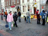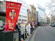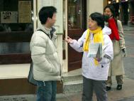一月十五日下午,在“勇气长城”的行列里散发资料时,一西人主动前来索取中文真象光碟,并告诉我们他有两个中国朋友,他们不知道法轮功真象,所以他要将光碟寄给他们。我们立即向他道谢。一中国女士接到真象资料后非常想和我们聊一聊,但她不会说普通话,但能听懂粤语。正巧旁边一学员说她会点粤语,于是她们聊了很久。