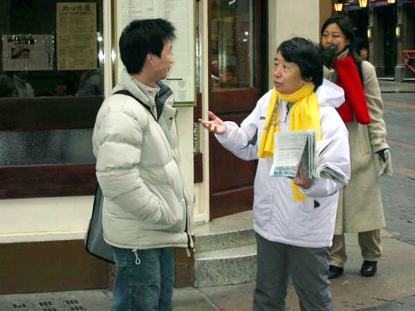 一月十七日利用下午返回的间歇,我们再一次到中国城讲真象。有的演示功法,有的散资料,当天有许多中国人过往,我们微笑着说声你好,然后递上资料,大部分人都接了。看到有停下脚步的,我们就主动面对面讲真象,从天安门自焚假案到多国诉江,从国内法轮功学员在残酷迫害下向人们讲真象到国外学员舍弃自我、利用各种条件讲真象反迫害,从我们修炼前后身心的巨大变化到法轮功对人类社会的益处。我们的话发自内心,他们听了频频点头。最后我们告诉他们,我们坚信当全世界人民都知道迫害真象时,就是邪恶灭亡之日,希望能把你们了解的真象告诉国内被蒙蔽的亲朋好友。我们总是得到同样的回答:我会的。