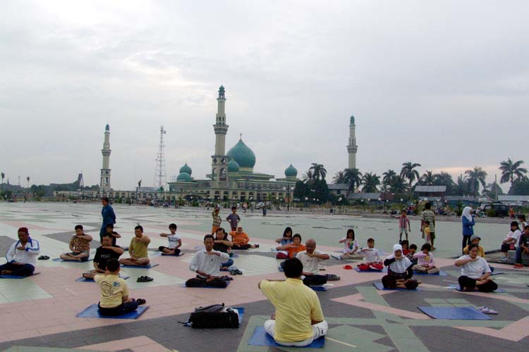 ![]() 清真寺前的集体炼功 | ![]() 教新学员炼功 |
