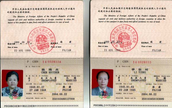 ![]() 被中领馆无理拒延的李依时夫妇的护照 |
