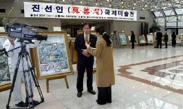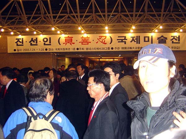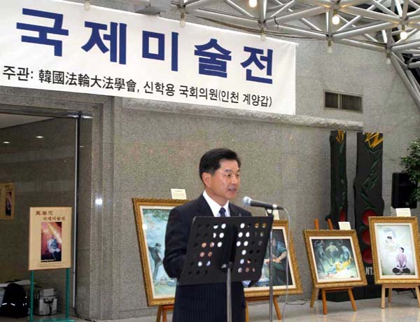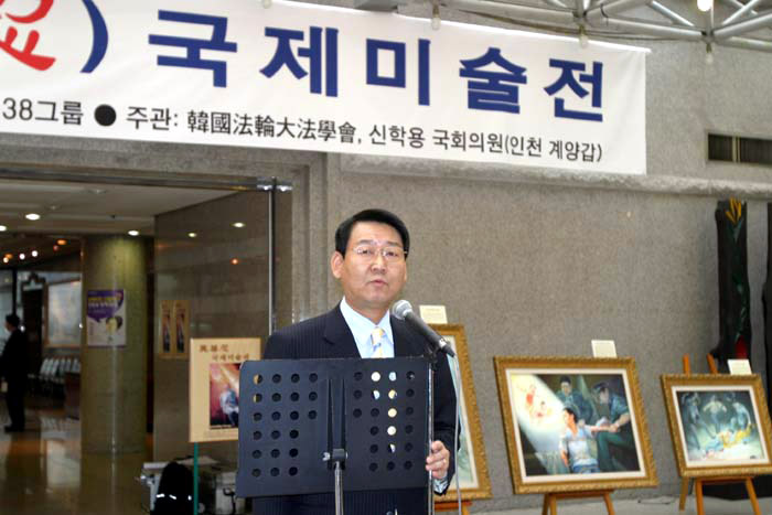 在“坚忍不屈的精神”世界美术展进行得如火如荼的2004年11月初,韩国法轮功学员就中共江氏集团侵犯人权的问题向国会议员讲了真象,并介绍了美术展。最后,韩国法轮大法学会与辛鹤用国会议员(仁川桂阳甲区)共同在大韩民国的立法部门──国会,举行了美术展。