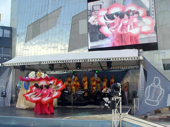 学员们表演了“莲花舞”、法轮功功法演示、腰鼓阵、唐装舞和扇子舞,大会乐队现场演奏“普度”、“法轮大法好”等乐曲配合学员们的演出。典雅传统的舞蹈,极富中华神韵的乐曲使整个联邦广场沉浸在祥和美好的祝福之中。表演尾声,学员们向土著人赠送了一面绣着“真、善、忍”的锦旗,寓示神赐福于人,意味深长。当晚,在现场观看演出的市民超过3万人,多家当地电视台进行了实况直播或转播。