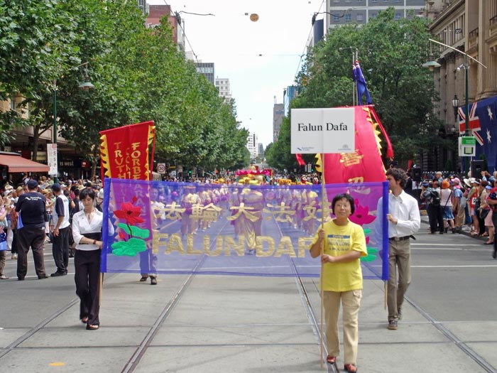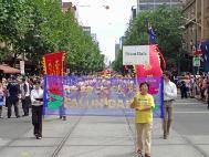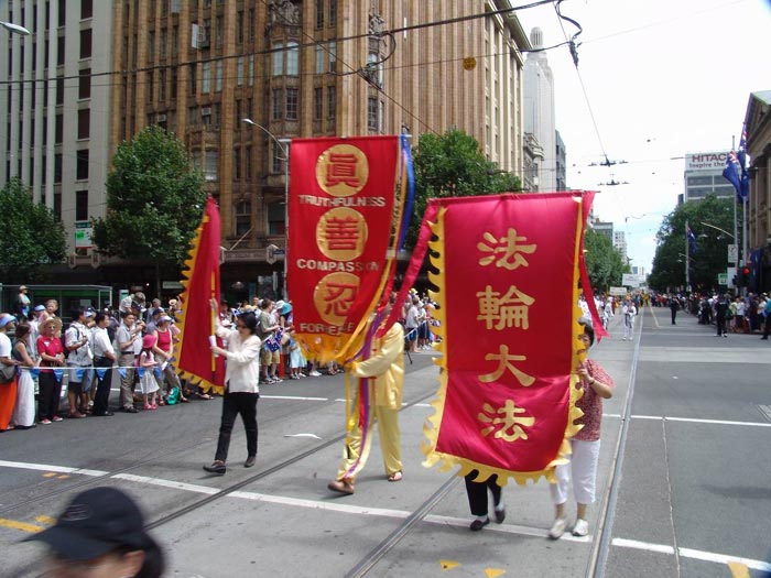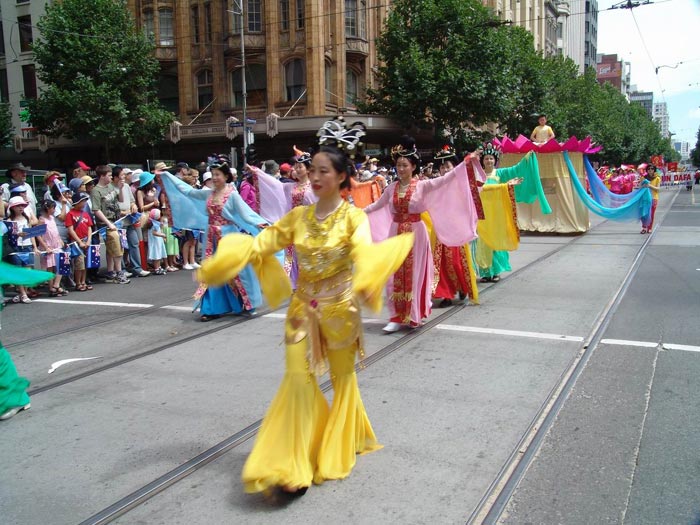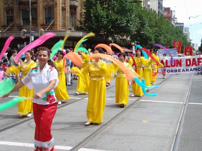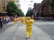 当天上午,来自墨尔本和悉尼法轮功学员近百人参加了一年一度的墨市国庆万人大游行。数十个来自不同民族的社团参加了当天的游行活动。法轮功学员队伍精神抖擞的打起“法轮大法好”和“真善忍”的大旗,以威仪整齐的腰鼓阵开道,随后是小弟子端坐在大型莲花车上展示第五套功法,还有引人入胜的唐装舞、扇子舞和长绸舞。在“法轮大法好”的音乐声中,法轮功学员队伍成为整个游行队伍中最亮丽的一段,所到之处,人们都被法轮功学员队伍所展现出来的天人合一的中华文化,以及祥和向上的精神所感染,发出由衷的喝彩和赞叹,纷纷与学员们合影。有在场华人当即表示:法轮功学员出现在这样一个令全市人民瞩目的大游行中,真是太好了!