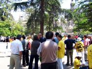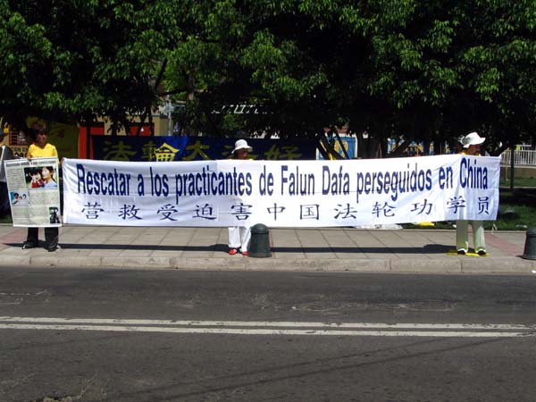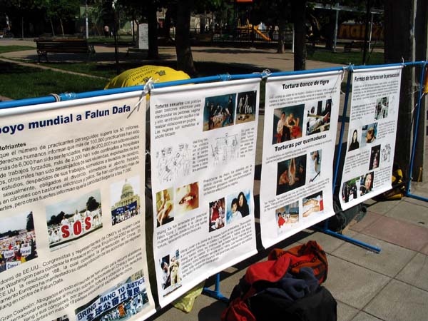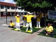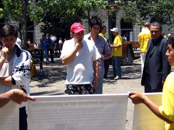17号,我们来到中心广场演示法轮功功法,同时还展示了揭露中共江氏集团迫害法轮功的西班牙语真象展板,人们纷纷驻足观看并索取传单,效果非常好。许多人看了真象展板惊叹的表示法轮功学员不象中国大使馆在电视中说的那样。美国之声电台颇有兴趣的采访了法轮功学员。