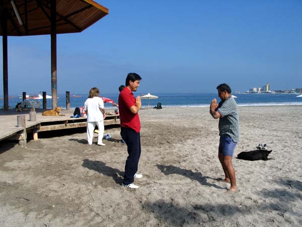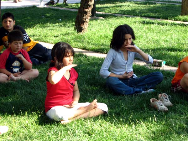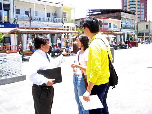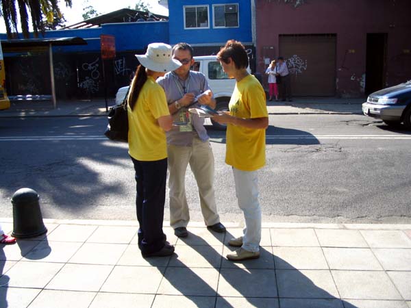 2004年11月16号我随秘鲁同修到达智利首都圣地亚哥之后,与来自法国,西班牙,瑞典,美国,墨西哥,澳洲,多米尼加,委内瑞拉和智利的法轮功学员一起在旅馆对面的小公园炼功学法。中午,智利学员告诉我们去市中心的一个广场演示功法,电视台将在那里作现场直播采访。当我们来到广场时,见警察设路障封闭進广场的路。大家向警察发放传单讲真象。警察送我们到附近居民区的街心公园。我们整齐的站好队开始炼功,电视台分别采访了智利,秘鲁,澳洲,美国法轮功学员。