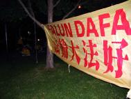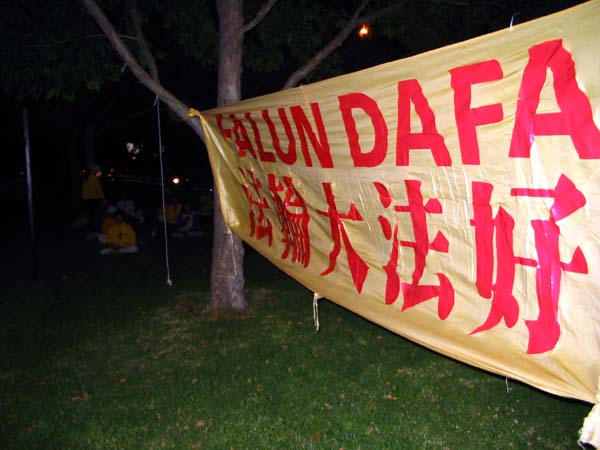 我们带去的几千份传单很快发完了。学员专门回旅店取传单,发放至夜幕降临。接着我们直奔中国国家主席胡锦涛下榻的酒店,我们在酒店对面警察指定的地点,炼功,发正念。挂在公路两边的横幅,正对着中国代表团车辆来往的必经之路。车辆的灯光照射在横幅上“法轮大法好”的字样显得格外的醒目耀眼。当我们离开时,警察过来帮我们叫计程车。