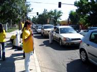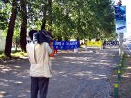 一辆挂着“南航”字样载满中国人的大巴士在我们的跟前停下,司机下车搬路障。这时坐在最前排的一位女士看见我们在车门口慌忙站起来拉车门,见拉不动车门就用小小窗帘布极力的想裹住自己的身体,那种惊吓的样子让我非常吃惊。坐在她后面的一位男士向我挥着拳头。我笑着对他说“法轮大法好”。车内的中国人虽然都不敢接传单,但大多数以赞许的眼光看着我们。