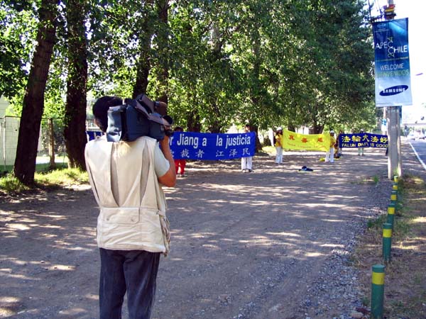 11月20日是APEC的高峰会议。一大早来自西班牙,法国,英国,美国,秘鲁,委内瑞拉,哥伦比亚和刚从昨天赶来的阿根廷等各国法轮功学员集中在APEC会议中心地点的大门口前集体炼功。而后,组成两个小组分别守在会议中心的两侧。