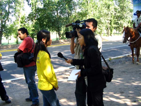 ![]() 挂在中国代表团下榻酒店对面的横幅 | ![]() 在智利北部Iquique洪法接受本地电台采访 | ![]() 学炼法轮功的有缘人 |
