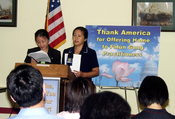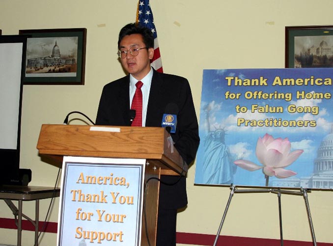 在新闻发布会上,任教于美利坚大学的刘博士作为华府法轮功学员的代表发言说:“美国就是由三百年前为逃离宗教迫害的清教徒们建立的,三百年后,美国还能秉持信仰自由和人权的立国之本,为法轮功学员提供庇护,美国也会因此而得到神的佑护。”