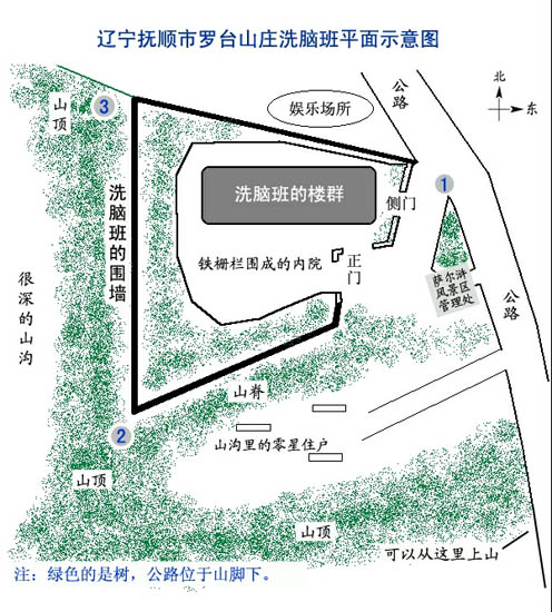![]() 罗台山庄洗脑班地理位置示意图 | ![]() 罗台山庄洗脑班平面示意图 |