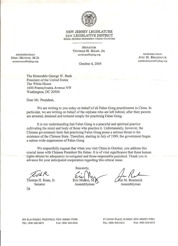 三位议员最后敦请布什在10月份访问中国时,向胡锦涛提出这一关键问题。议员们说:“充分调查这些侵害人权的行为并惩罚那些应负责任者,具有至关重大的意义。”