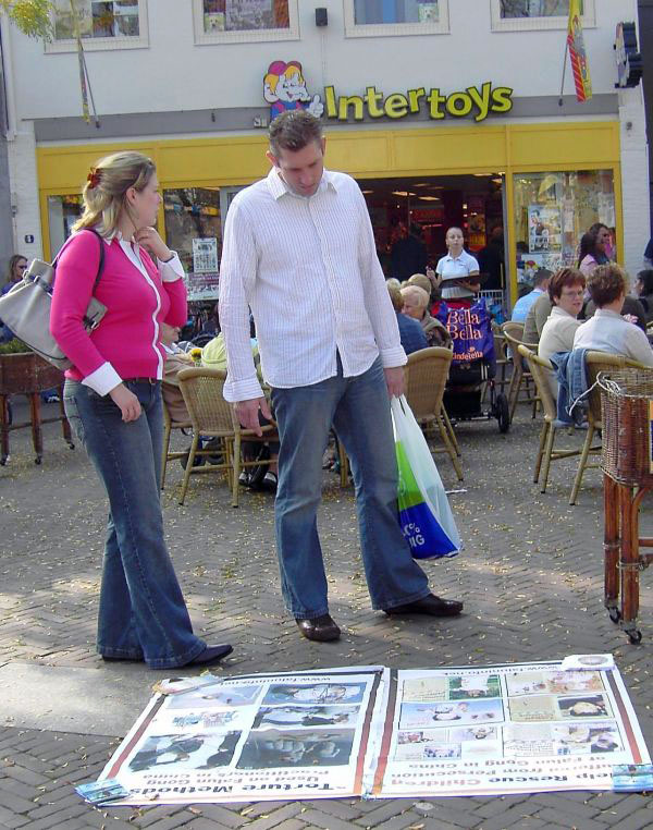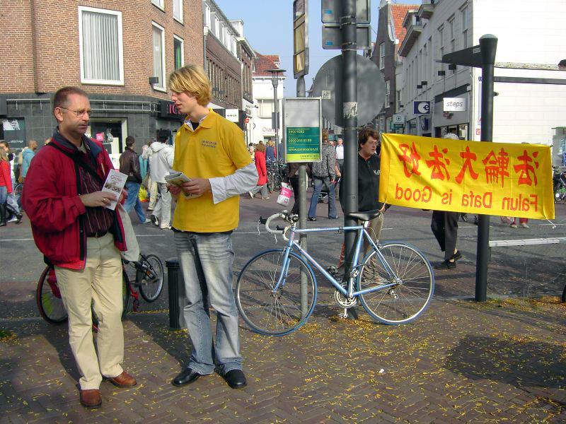 和阿姆斯特丹相比较,这是一个保守的城市。很多人对法轮功和这场迫害不太了解。路过展位时,有的人被功法演示吸引,有的人被真象图片吸引。他们在阅读,在思考。我和同修给他们讲完真象后,很多人马上签名声援诉江案,有的人索取报纸,表示進一步了解后再做决定。还有一位有华裔血统的女士对学功感兴趣,她特地索取了法轮功学员的联系方式。