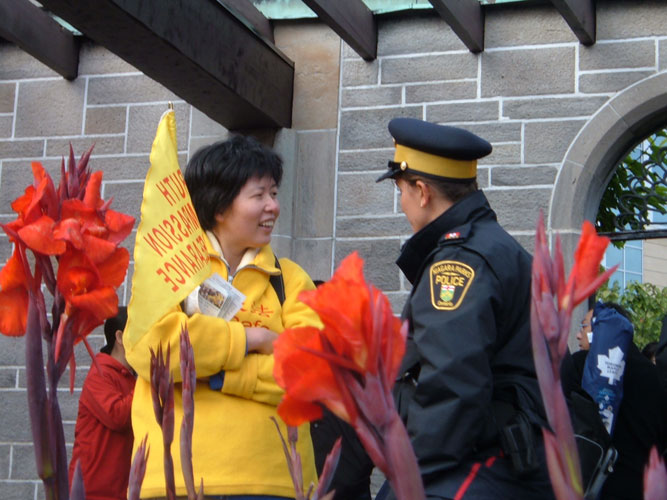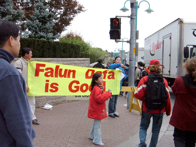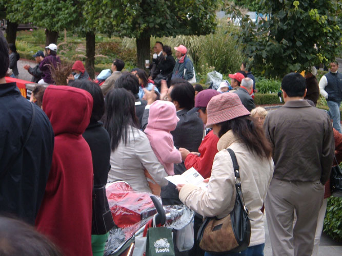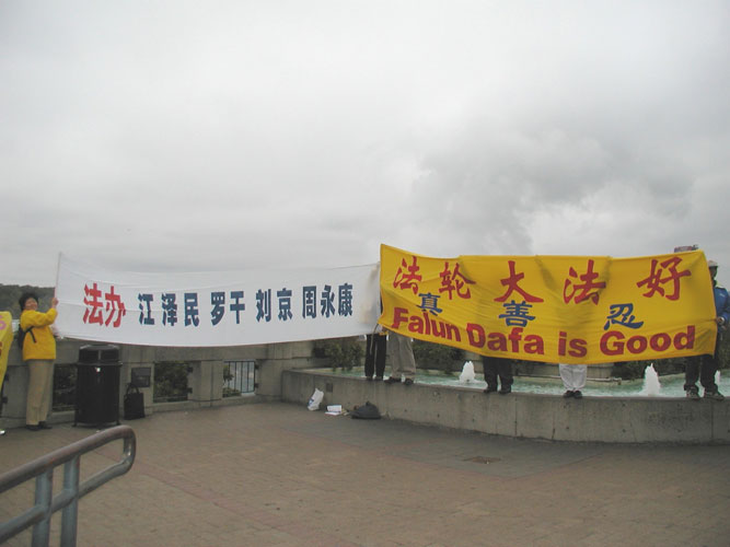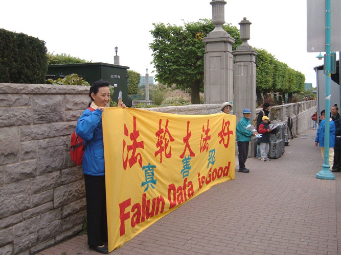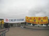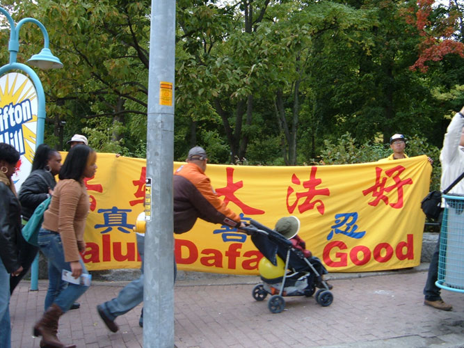 看着法轮功学员和“法轮大法好”的横幅,有人露出惊喜的样子说:“法轮功也来了。”很多人都接过了真象资料并表示感谢。