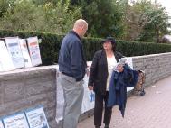 一位学员在门口发资料时,遇见她的一位十几年不见的同班同学,她的同学惊喜的说:“你还坚持炼法轮功啊?我以为你们都放弃了呢。”分别时学员要送一本真象小册子给他,他指着自己的口袋说:“从那边过来时我已收到一份了。”