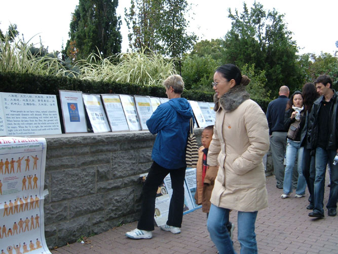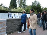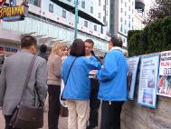 法轮功学员收到“通知”后,在音乐会开始之前,就在会场的各个進出口拉好了横幅,摆好了展板,手拿着真象资料在等候着有缘的中国同胞。