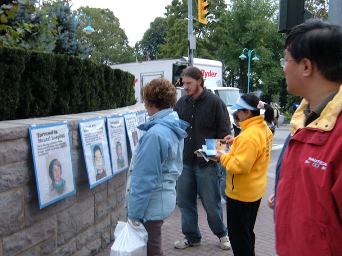 一家三代五口的中国人,進场时接了很多真象资料。出场时高兴的拉着学员手中的“法轮大法好”横幅照相。我走过去问他们知道法轮功吗?10岁的孙女抢着跟我说:“都知道,还非常的清楚。我们刚从大陆移民来没多久,我要把相片寄回给大陆的朋友,告诉他们我在尼加拉大瀑布遇到法轮功了。”