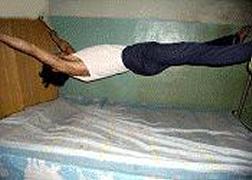 将受刑者固定在床上,手和脚成大字型,用手铐和绳套固定在四个床角上,身体抻的直直的,一动不能动,肌肉被绷得紧紧的,高度紧张。这种酷刑是不间断的,拉尿在床上,没人管,吃饭睡觉也不松开,身体长时间一个姿势,肌肉被抻得绷直,其痛苦无法形容。很多法轮功学员都被这样迫害过。
