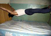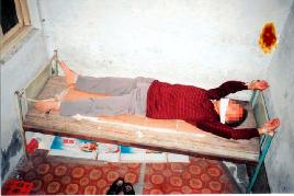 2002年4月5日,我被带到二楼的一间小屋里,只见屋里床上绑着一个人,四肢被紧紧拉在床四角,床上没有板,只有一块板垫着脖子,看样子已绑了很长时间,它们用电棍电他玩。
