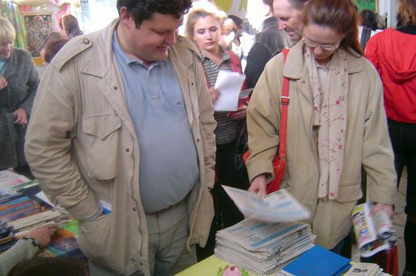 人们对法轮功书籍感兴趣第一天的展览会上来了很多的当地媒体,有3百万观众的《伏尔加》电视台采访了当地的法轮功学员,并在晚间新闻的时候播放,当地另外一家电视台也对法轮功学员参加展览進行了报道。