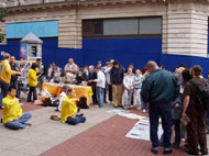 在酷刑图片前,人们对当今社会仍然在发生的残酷迫害感到非常震惊。很多人仔细阅读展板上的内容,主动走到桌子前签名谴责共产党的暴行,声援法轮功。